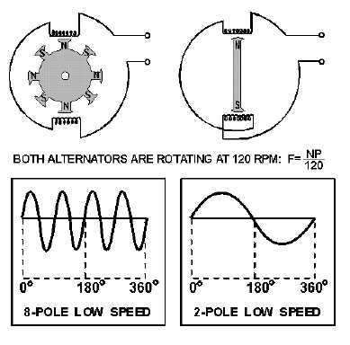 La fréquence (= le nombre de période par seconde) de la tension, dépendra du nombre de pôles que compte l’alternateur et de la vitesse de rotation du rotor :