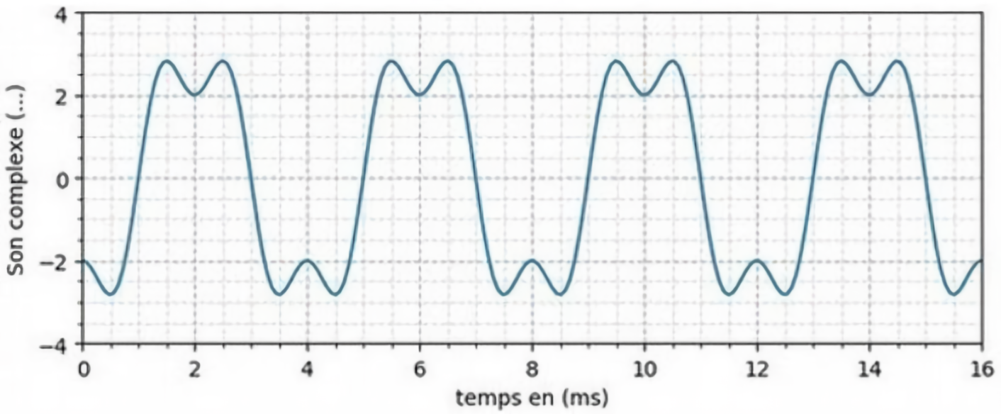 Calculons sa fréquence \(f\) : \(\begin{aligned}f &= \frac{1}{T}\\f &= \frac{1}{0,03}\\f &= 33,3 \text{ Hz}\\\end{aligned}\)