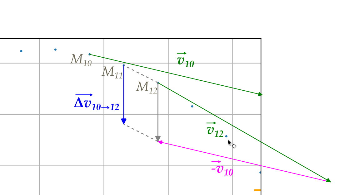 Le vecteur variation de vitesse entre les points \(i\) et \(j\) se note \(\overrightarrow{\Delta v}_{i \rightarrow j}\). On le place généralement entre les points i et j.