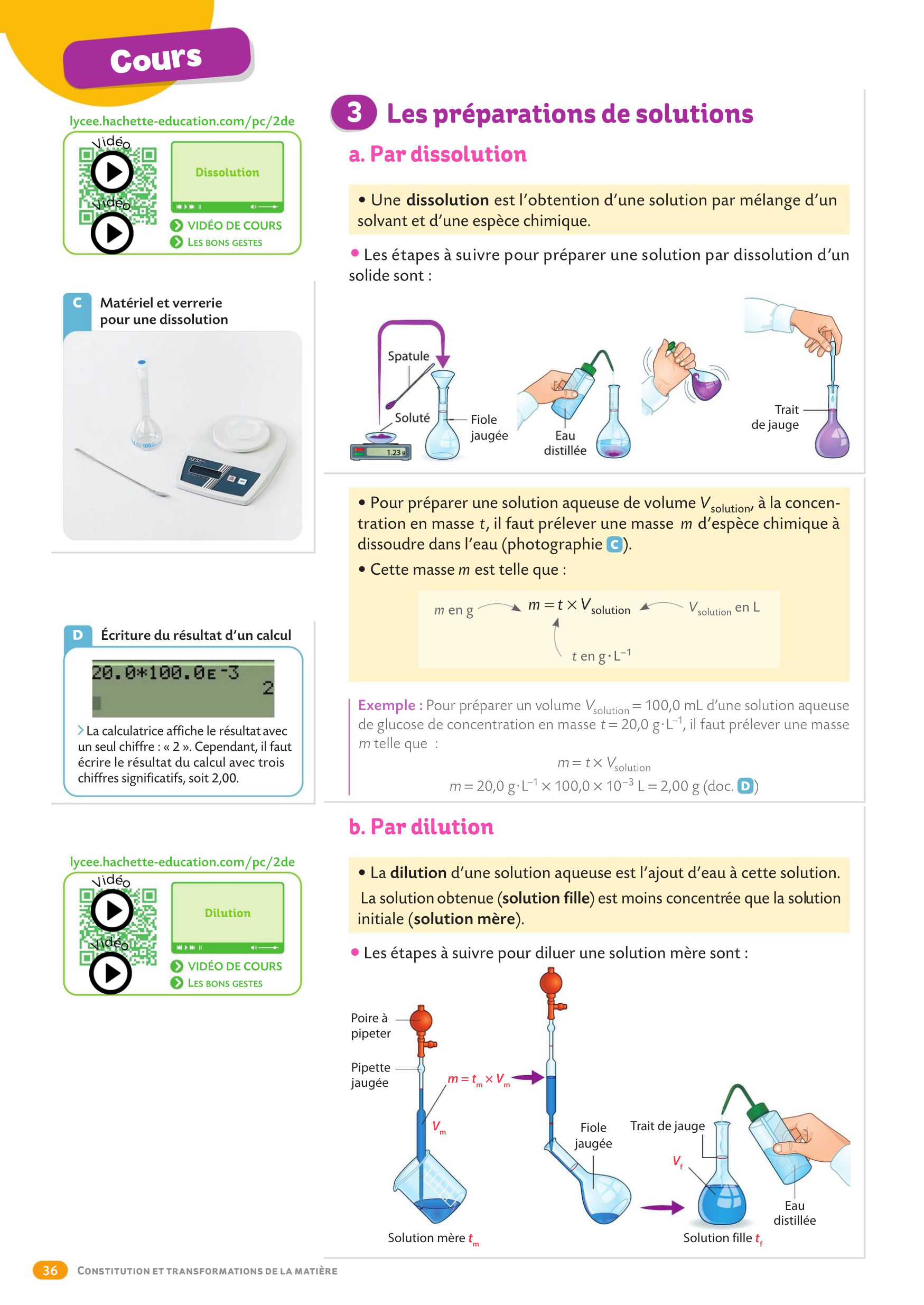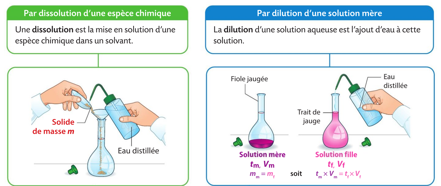 dissolution ?|<ul><li>Peser à l'aide d'une <strong>coupelle de pesée</strong> et d'<strong>une balance</strong></li><li>Verser dans une <strong>fiole jaugée</strong> avec <strong>un entonnoir à solide</strong> ;</li><li>ajouter un peu d'eau distillée et homogenéiser ;</li><li>compléter jusqu'au trait de jauge.</li>