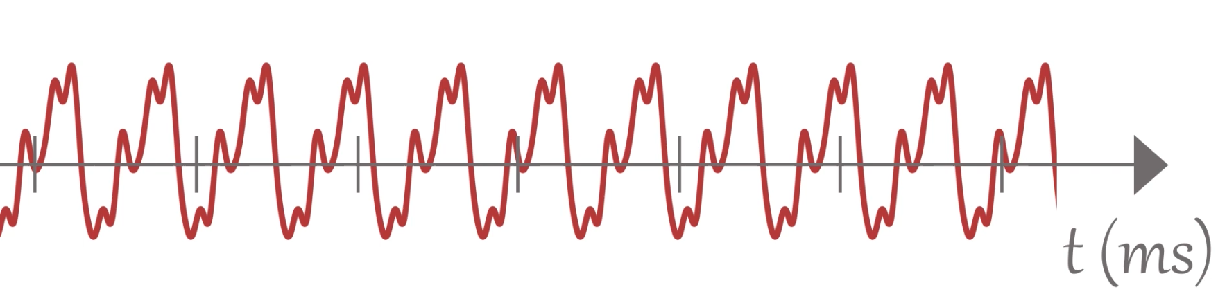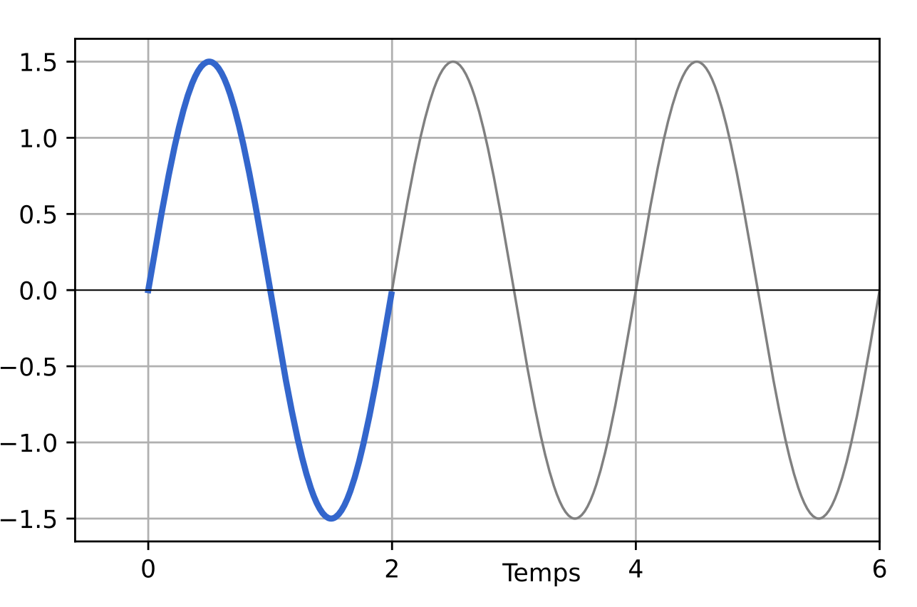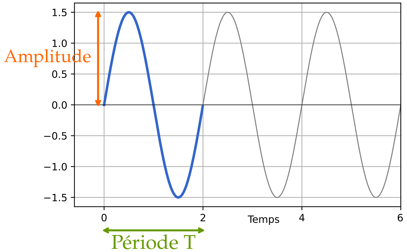 La période T d’un phénomène périodique est la durée du plus petit motif qui constitue le signal. Elle s’exprime en secondes