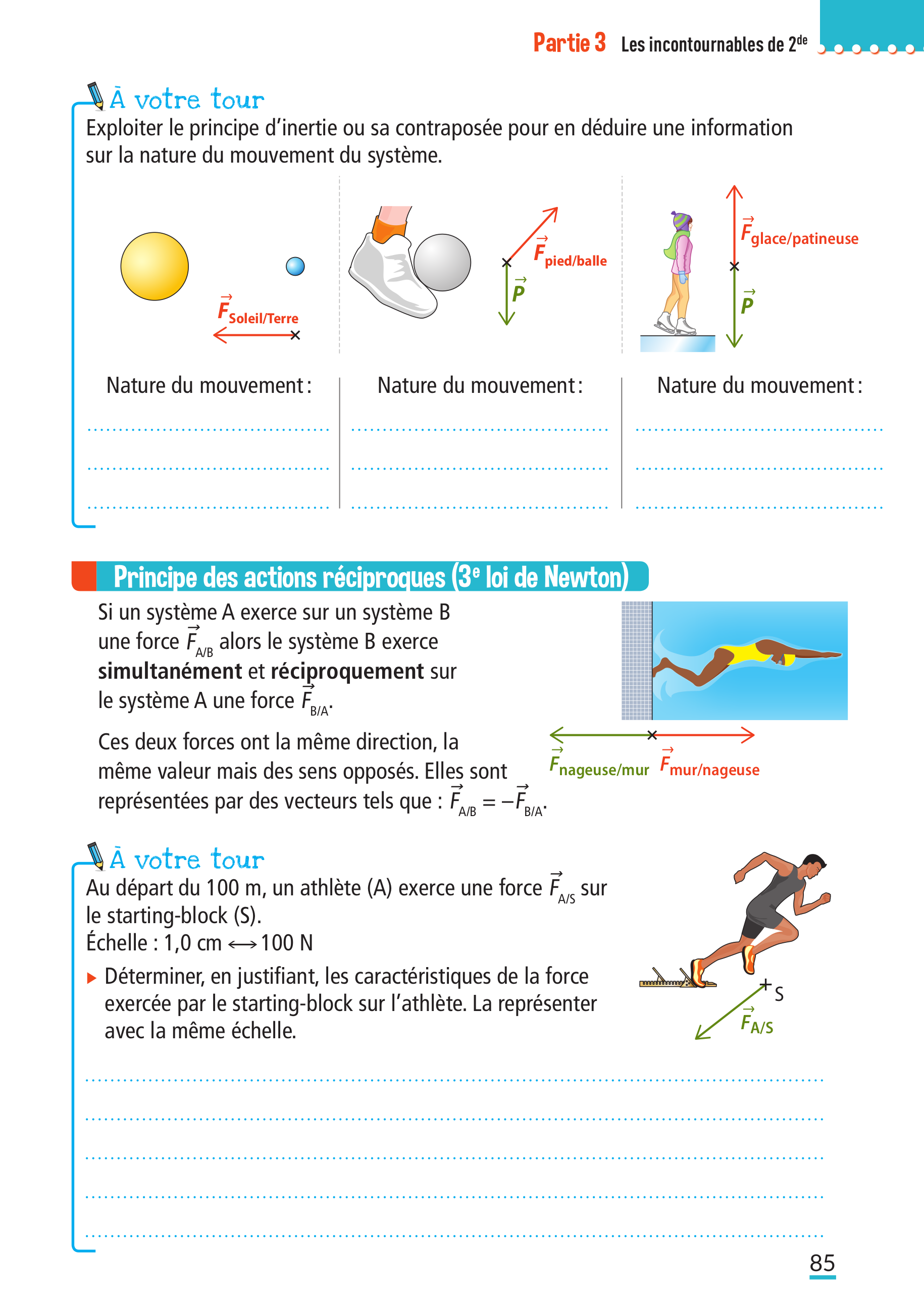 Si un objet A exerce une force \(\overrightarrow{F_{A/B}}\) sur un objet B, alors il existe toujours une force \(\overrightarrow{F_{B/A}}\) exercée par l’objet B sur l’objet A tel que :