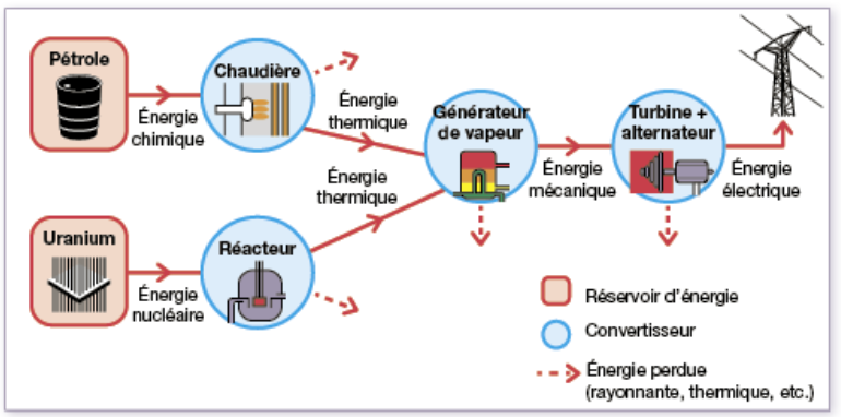 Pour les éoliennes, les barrages hydroélectriques et certaines centrales géothermiques, l’énergie primaire (énergie mécanique du vent, énergie mécanique de l’eau en mouvement, énergie mécanique de la vapeur d’eau) entraîne directement le mouvement de l’axe de l’alternateur. La conversion d’énergie primaire en énergie électrique est donc directe. Dans les autres centrales, l’énergie primaire (énergie chimique pour les combustibles, énergie nucléaire pour les noyaux d’uranium…) sert à chauffer de l’eau (contenue dans une chaudière) dont la vapeur va entraîner la rotation d’une turbine et d’un alternateur. La conversion d’énergie primaire en énergie électrique est indirecte.
